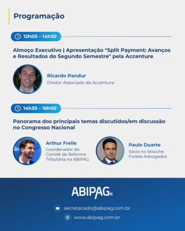 A programação contará com um Almoço Executivo, seguido da apresentação “Split Payment: Avanços e Resultados do Segundo Semestre”, conduzida por Ricardo Pandur, Diretor Associado da Accenture.